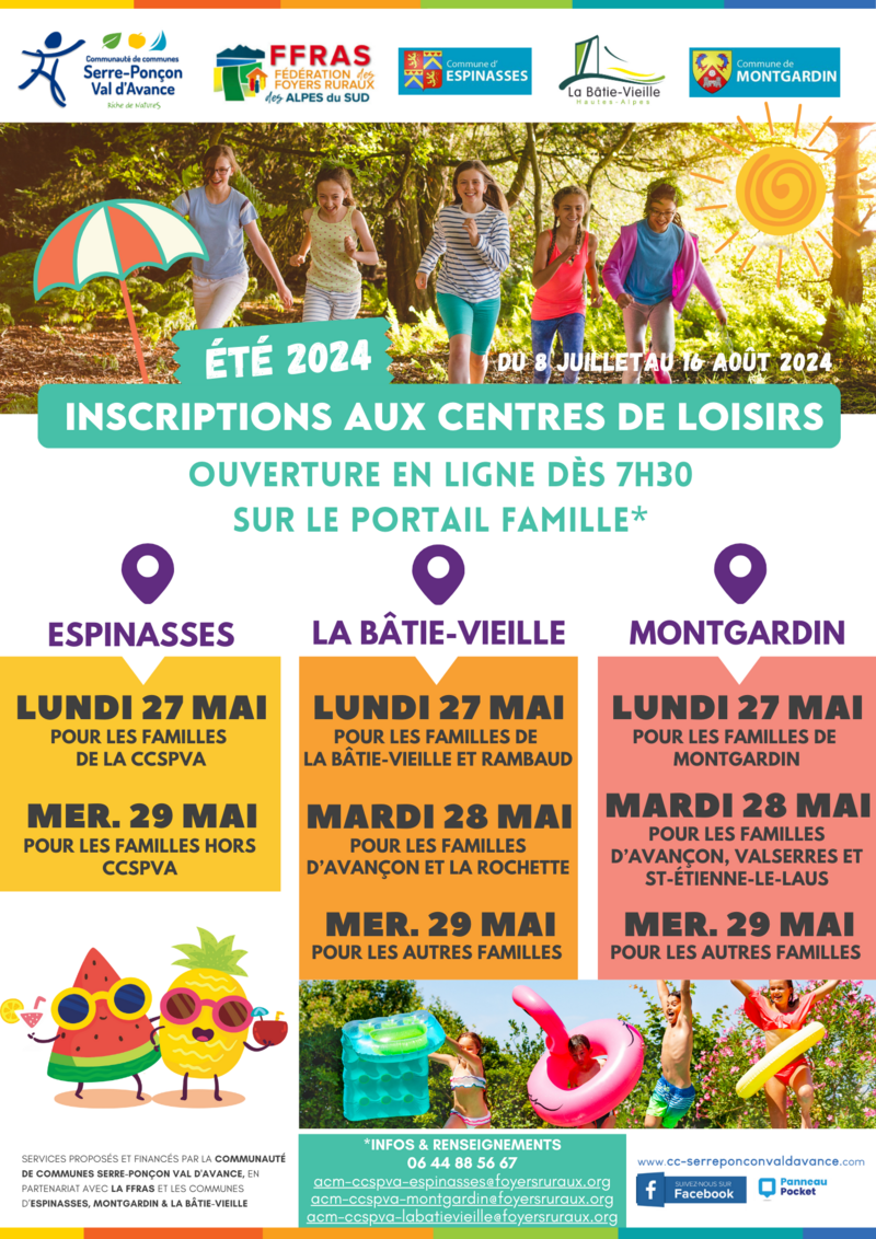 Les centres de loisirs d’Espinasses, Montgardin et La Bâtie-Vieille accueilleront vos enfants de 3 à 12 ans pendant les vacances d’été. Gérés par la Fédération de Foyers Ruraux des Alpes du Sud et la CCSPVA, ils seront ouverts 6 semaines du lundi 8 juillet au vendredi 16 août 2024 au sein des différentes écoles.