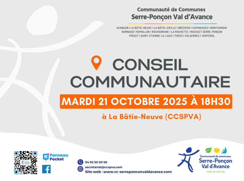 La prochaine réunion du Conseil communautaire se tiendra Mardi 21 Octobre à 18h30 au siège de la CCSPVA à La Bâtie-Neuve (33, rue de la Lauzière - Salle du conseil).