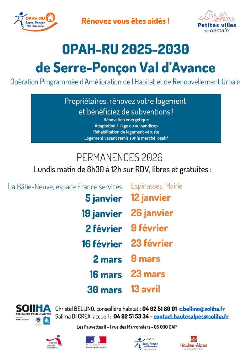 Pour vous informer sur vos droits et rencontrer l’équipe de l’OPAH, une permanence est proposée au public chaque lundi matin, de 8h30 à 12h dans les locaux France Services à la Bâtie-neuve, ainsi qu’à la mairie d’Espinasses (en alternance une semaine sur deux).