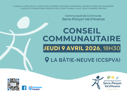 La première séance du Conseil communautaire se tiendra ce soir JEUDI 9 AVRIL 2026, à 18h30 dans nos locaux à La Bâtie-Neuve.